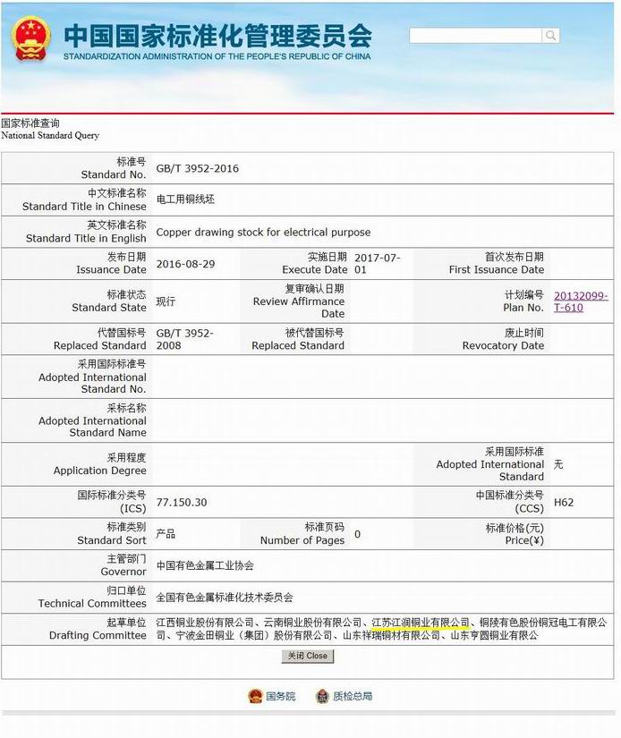 近日國家質檢總局、國家標準委公布了由國家質量監督檢驗檢疫總局、國家標準化管理委員會批準的國家標準《電工用銅線坯》(GB/T 3952-2016),替代現行的《電工用銅線坯》(GB/T 3952-2008),新標準將于2017年7月1日正式實施。
