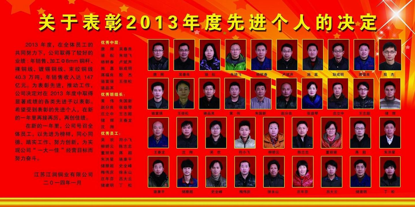 2013年度,在全體員工的共同努力下,公司取得了較好的業(yè)績:年銷售、加工Φ8mm銅桿、裸銅線、鍍錫銅線、束絞銅線40.3萬噸,年銷售收入達147億元。為表彰先進,推動工作,公司決定對在2013年度中取得顯著成績的各類先進予以表彰。希望受到表彰的先進個人,在新的一年里再接再厲,再創(chuàng)佳績。在新的一年里,公司號召全體員工,以先進為榜樣,同心同德、踏實工作、努力創(chuàng)新,為實現(xiàn)公司“一大一佳”經營目標而努力奮斗。優(yōu)秀中層:唐 輝、吳春良、駱 耘、朱培飛、楊鮮春、盧斌聲、施 嘉、耿成明、蔣福良殷 杰、駱富強、王俊松、駱品其優(yōu)秀班組長:黃 偉、朱國新、趙分良、張益琴、莊立中、王志超、儲 輝、王春龍、沈 翔優(yōu)秀員工:吳 歡、符小飛、柳嬌云、陳志忠、董麗娟、蔣 超、朱洪星、駱康平、儲滕超史全峰、梅偉慶、徐永山、莊年芬、呂大云、儲建明、丁 松